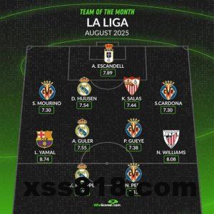 whoscored西甲8月最佳阵:姆巴佩领衔皇马3将,亚马尔、尼科在列