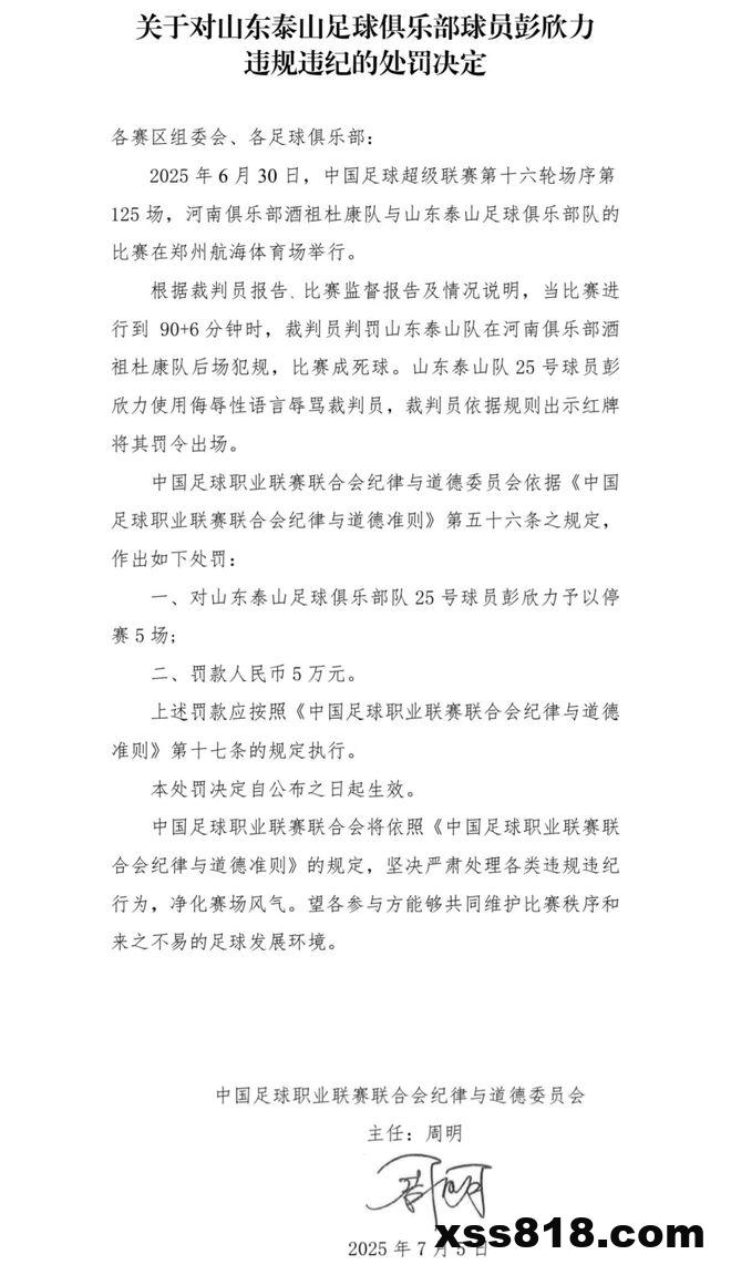 北京时间7月5日晚,中足联官方再次开出重磅罚单,效力中超豪门山东泰山俱乐部的中场彭欣力,因在上轮对阵河南的比赛中辱骂裁判员,被停赛5场并罚款5万元人民币。