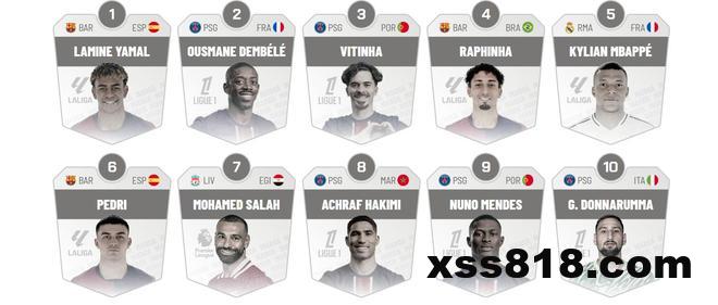 雷速体育7月25日讯 西班牙《马卡报》评出了上赛季百大球星,其中巴萨球星亚马尔排名第一,夺得欧冠的登贝莱和维蒂尼亚排名二三。