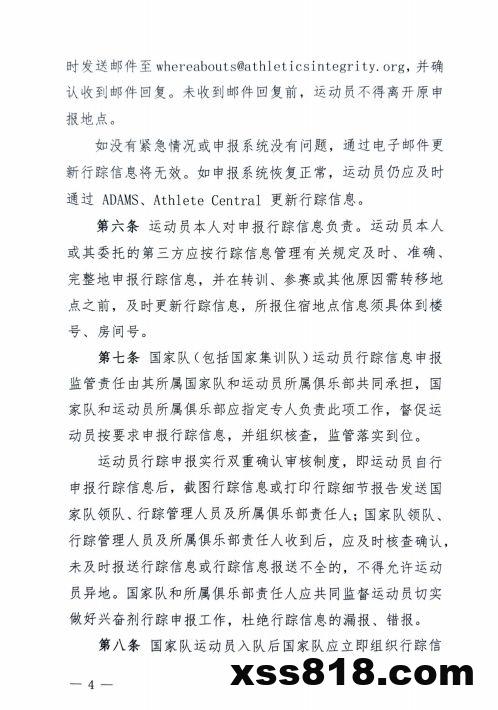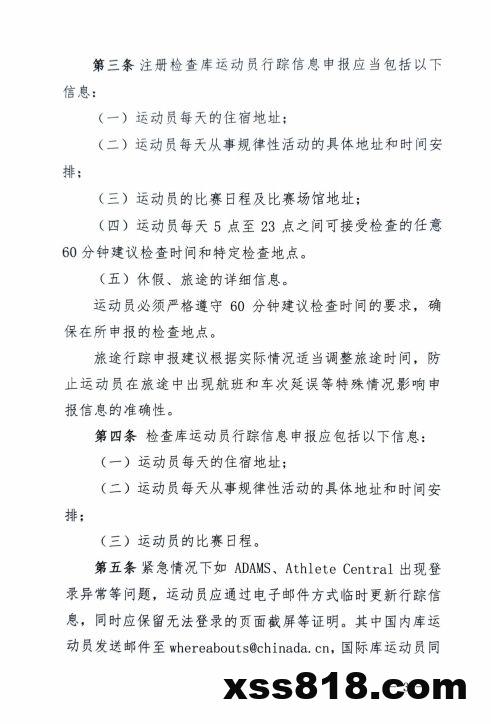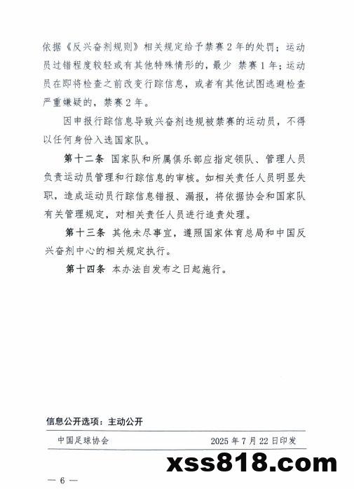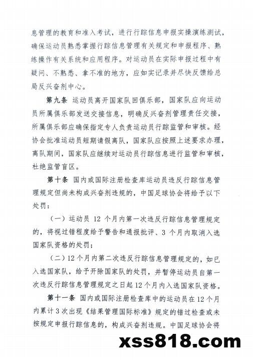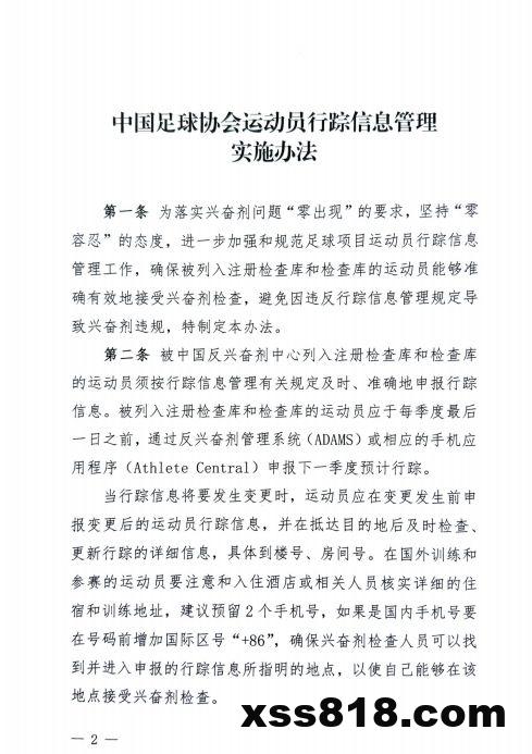 北京时间7月25日,中国足协发布关于印发《中国足球协会运动员行踪信息管理实施办法》的通知,为落实反兴奋剂工作,被中国反兴奋剂中心列入注册检查库和检查库的运动员须按行踪信息管理有关规定及时、准确地申报行踪信息。