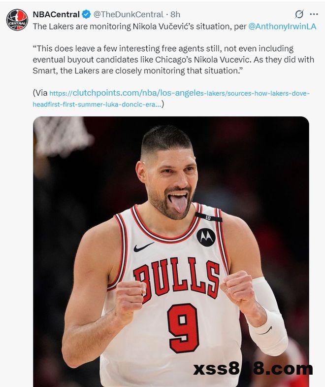 北京时间8月1日,根据湖人记者安东尼-劳瑞恩的消息,洛杉矶湖人队正在密切关注尼古拉-武切维奇的动向。他表示湖人还是希望在自由市场上进行一些选择,这其中包括一些潜在可能被买断的球员,比如公牛队的尼古拉-武切维奇,就像他们此前关注马库斯-斯马特一样。