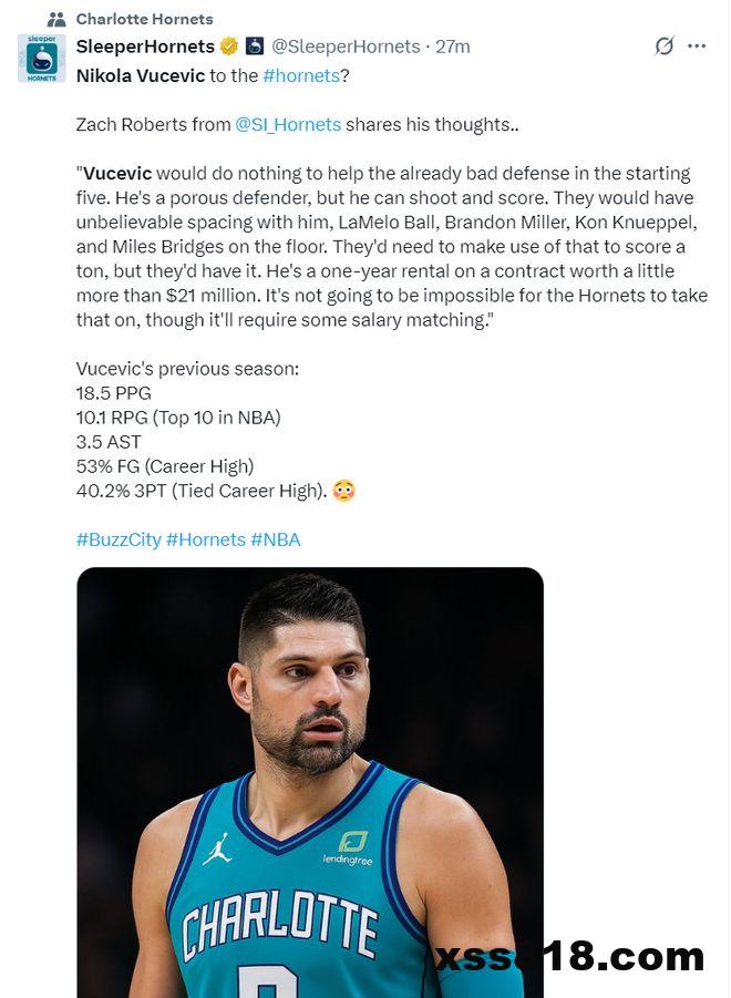 根据黄蜂媒体SleeperHornets的报道,武切维奇还剩一年2100万的到期合同,他不会对黄蜂糟糕的防守情况有任何改变,因为他也是一个防守漏洞,但他能投篮!如果有了武切维奇、拉梅洛、布兰登-米勒、克努佩尔、迈尔斯布里奇斯在场上黄蜂的空间会很大,黄蜂可以充分利用这一点。尽管这份合同有些大,但黄蜂也能进行相应的薪资匹配来接手这份合同。