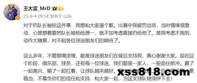 对于扔队长袖标这件事,我想和大家道个歉。比赛中我被罚出场,当时情绪很激动,心里想着要把队长袖标给源一,就不加考虑直接扔给他了。是我考虑不周到,动作太随意,对不起各位球迷朋友们的期待了。