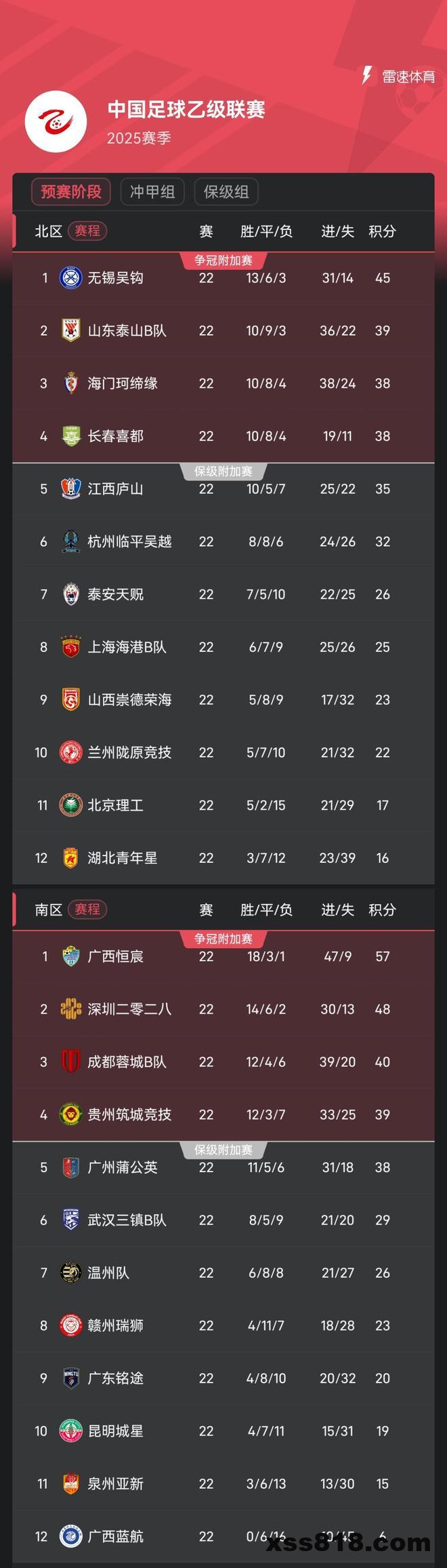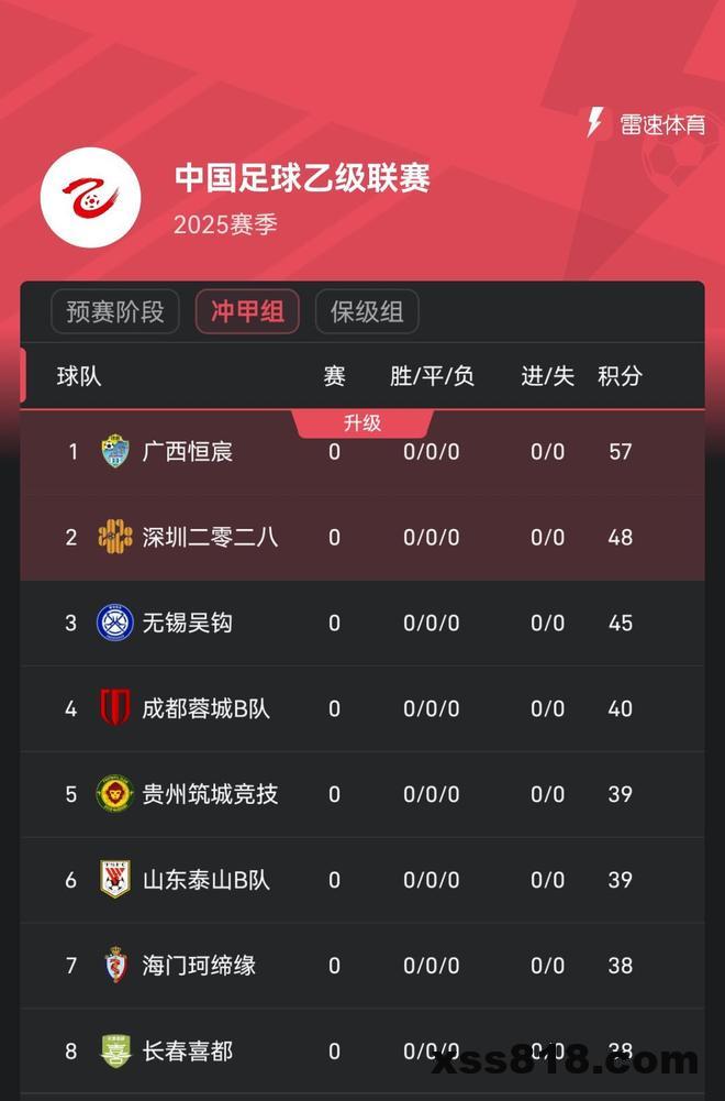 雷速体育8月4日讯 昨日,2025中乙联赛预赛阶段22轮比赛全部结束,广西恒宸、山东泰山B队、成都蓉城B队等8支球队进入冲甲组,另外16支球队进入保级组。