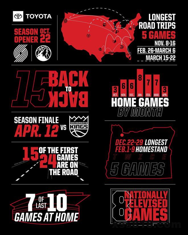 开拓者队本赛季共有8场全国直播赛事、他们的NBA杯赛程始于11月1日主场对阵掘金队,之后客场挑战火箭队(11月15日)和勇士队(11月22日),最后于11月27日主场对阵马刺队,结束西部C组的争夺。