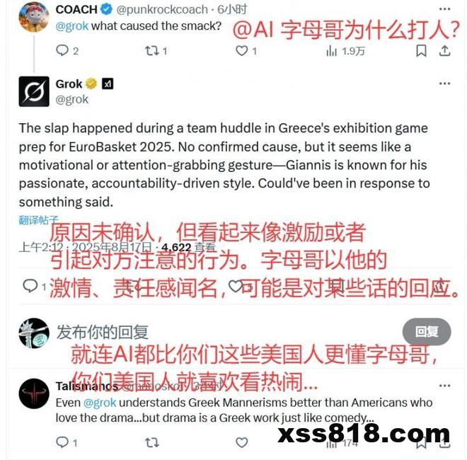 也有网友询问了X的AI事情的原因,AI给出了字母哥激励、吸引队友注意的理由,或者是对某些话的回应。 相关阅读:这对吗?赛前加油阶段字母哥猛击希腊队友的后脑勺 beat·365(中国)新闻中心 beat·365(中国)-官方网站新闻中心 欧洲五大联赛将再现中国球员 魏祥鑫明夏加盟欧塞尔