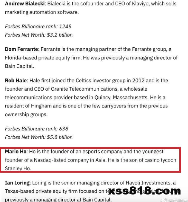 值得一提的是,“亚洲赌王之子”何猷君也是凯尔特人的新股东之一。何猷君曾在波士顿留学多年,他曾表示刚到美国就喜欢上凯尔特人,而杰伦-布朗是他最喜欢的球星。