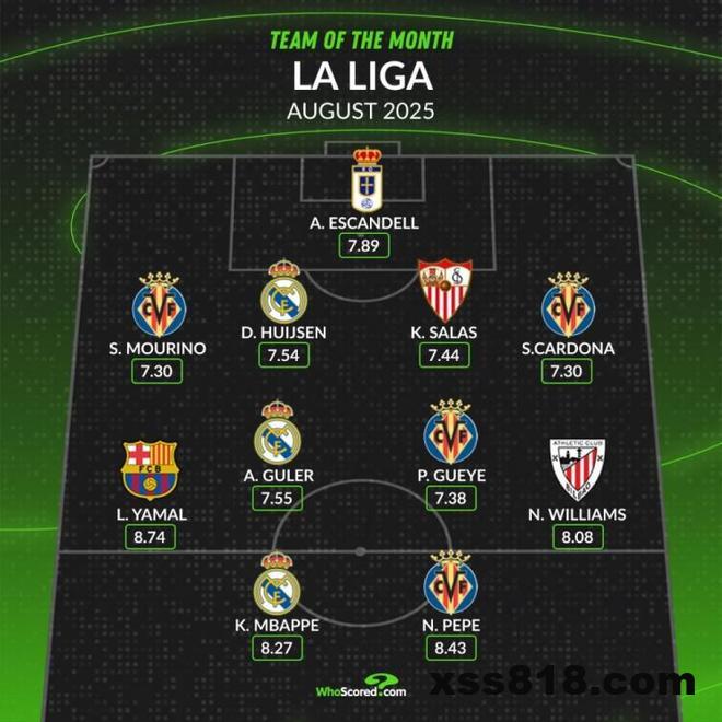 直播吧9月2日讯 五大联赛迎来短暂休赛,whoscored也统计了西甲8月评分最佳阵容,黄潜4人、皇马3将在列。