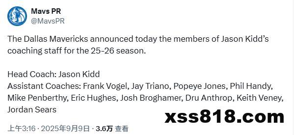 北京时间9月9日,达拉斯独行侠队的球员阵容很豪华,如今他们已通过官方正式确认了2025-26赛季主教练杰森-基德的教练组名单,同样是阵容豪华。