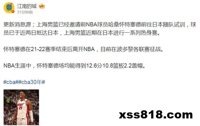 媒体人江南的城接连报道,他此前透露一支南方球队在接触怀特塞德,如今继续更新消息源表示:“上海男篮已经邀请前NBA球员哈桑-怀特塞德,前往日本随队试训,球员已于近两日抵达日本,上海男篮近期将在日本进行一系列热身赛。”