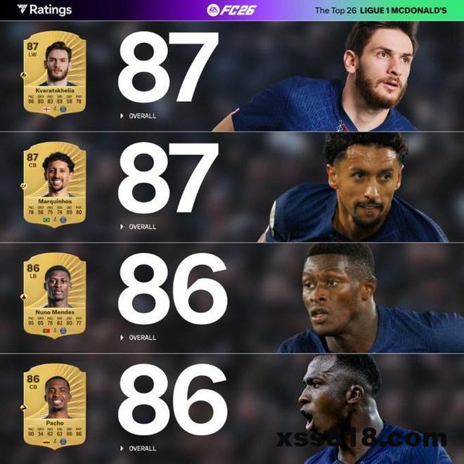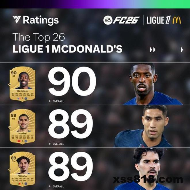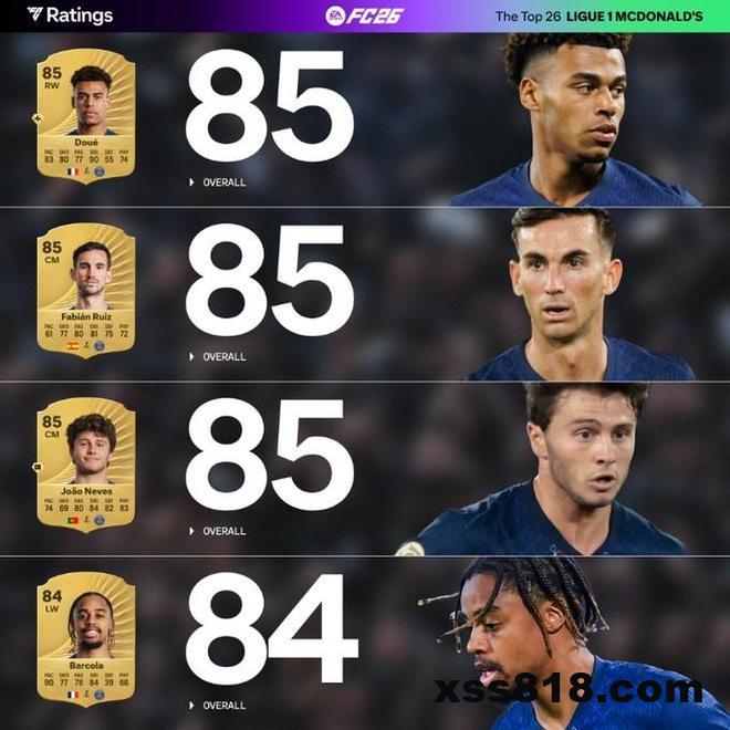 直播吧9月13日讯 FC26公布了法甲球员评分榜,其中登贝莱居首,具体如下:
