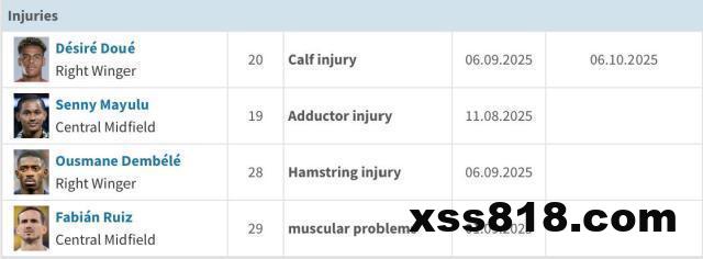 登贝莱从欧冠半决赛开始身体情况就不够好,世俱杯缺席了一半赛程,法甲开赛后一直状况不佳,最终在国家队比赛中拉伤大腿将缺阵2个月。法维安·鲁伊斯从上赛季下半段开始近乎全勤,但他也是在本次FIFA比赛日受伤。