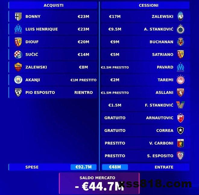 既然是夏窗,那我们先算转会成本。管理层在“保持主力框架稳定、推进阵容年轻化”思路下开始进行引援操作,共花费9270万欧引进了博尼、恩里克、迪乌夫、苏西奇及阿坎吉5名新员,而通过出售扎莱夫斯基、布坎南、塔雷米、斯坦科维奇兄弟、萨特里亚诺,出租帕瓦尔、阿斯拉尼共收获4800万欧。这样算下来,国米夏窗的引援净投入达到4470万欧,在意甲中仅次于科莫和尤文排在第三。