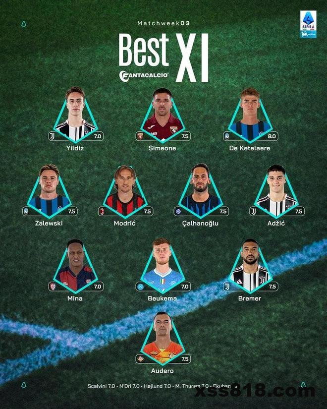 意甲官方公布了第3轮联赛最佳阵容,莫德里奇、凯南-伊尔迪兹和布雷默等人在列。