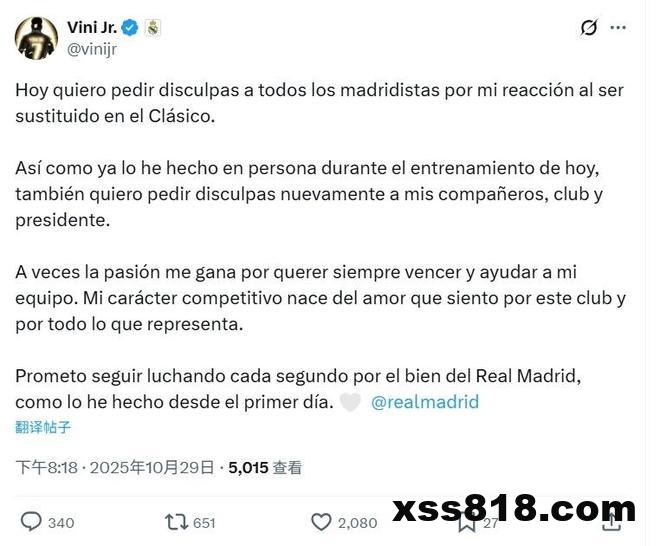 维尼修斯社媒写道:“我想就我在国家德比中被换下时的反应,向所有马德里球迷道歉。正如我今天在训练中亲自所做的那样,我也想再次向我的队友、俱乐部和主席道歉。”