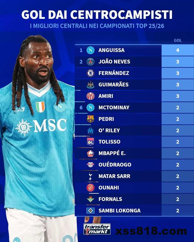 北京时间10月29日,德转统计出了本赛季至今欧洲五大联赛中场球员的进球榜,近两轮意甲连续得分的安古伊萨以4球排名第一,若昂-内维斯、恩佐-费尔南德斯、布鲁诺-吉马良斯以及阿米里以3球并列第二。