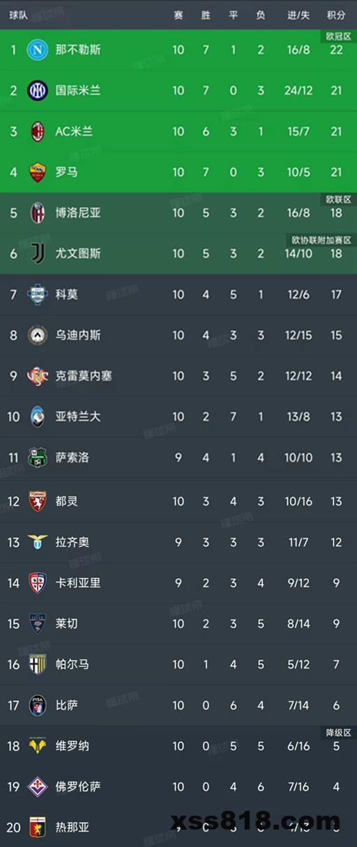 北京时间11月3日,意甲第10轮结束了8场比赛,最新积分榜如下!