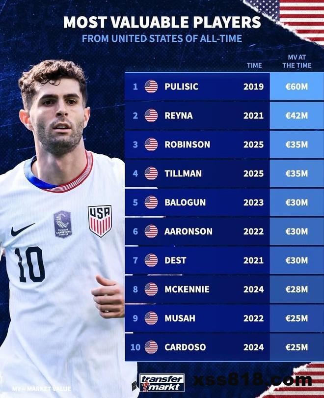 北京时间11月16日,德转列出了美国球员历史身价排名前10的球员,2019年身价曾经达到6000万欧元的普利希奇高居第一,吉奥瓦尼-雷纳4200万欧元第二,安东尼-罗宾逊和马利克-蒂尔曼同以3500万欧元并列第三。