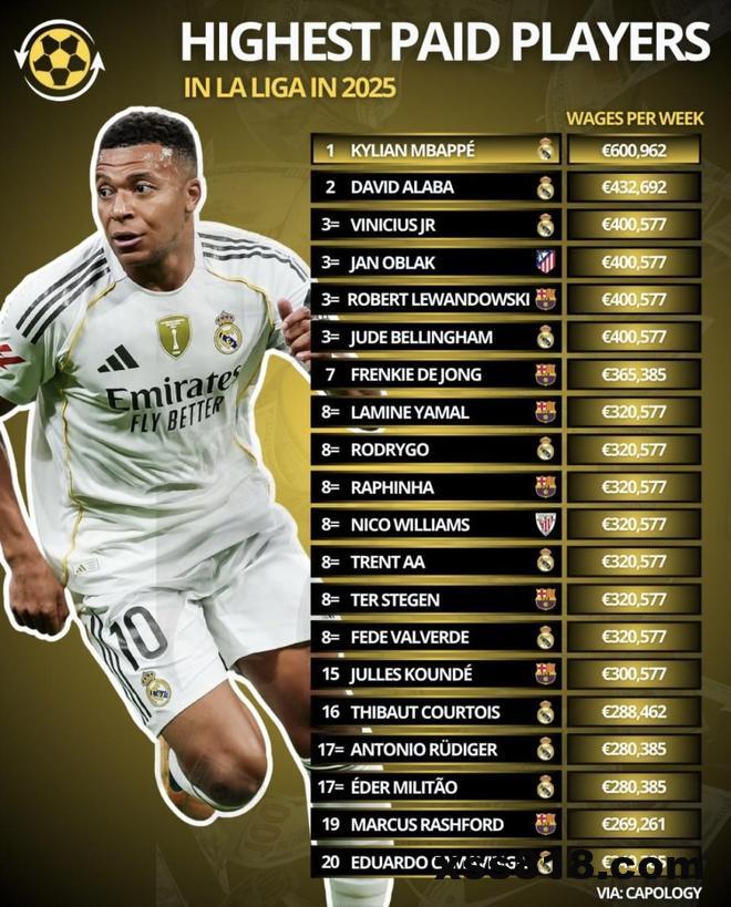 最近球员公司(Capology)发布了西甲球员周薪榜:姆巴佩领跑,较第二名高约38.9%;皇马上榜11人、巴萨7人,马竞与毕尔巴鄂各1人。榜单直观看到皇马在顶薪段占主动,形成“顶薪+核心平台”的梯度;巴萨更多押在32万欧元/周的平台上,却要同时扛住老将高薪与新星提价的拉扯——这套薪资结构更稳,还是更难续?下面就按俱乐部拆开聊。