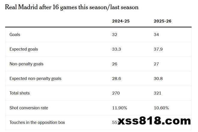 如下表所示,实际上今年在阿隆索的带领下,皇马产生的预期进球值比去年更高,总进球和非点球进球也更多。但他们的射门转化率却下降了,尽管在对手禁区内的触球次数和射门次数都比上赛季多。