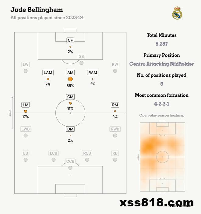 阿隆索在几次新闻发布会上表示,希望他踢中场位置,同时不失去在对方禁区的影响力。贝林厄姆则更倾向于踢更靠前的位置,就像他前任教练卡洛·安切洛蒂使用他的方式一样。下图显示了贝林厄姆自2023年加盟皇马以来主要踢攻击型中场,同时在上赛季也出现在左路。