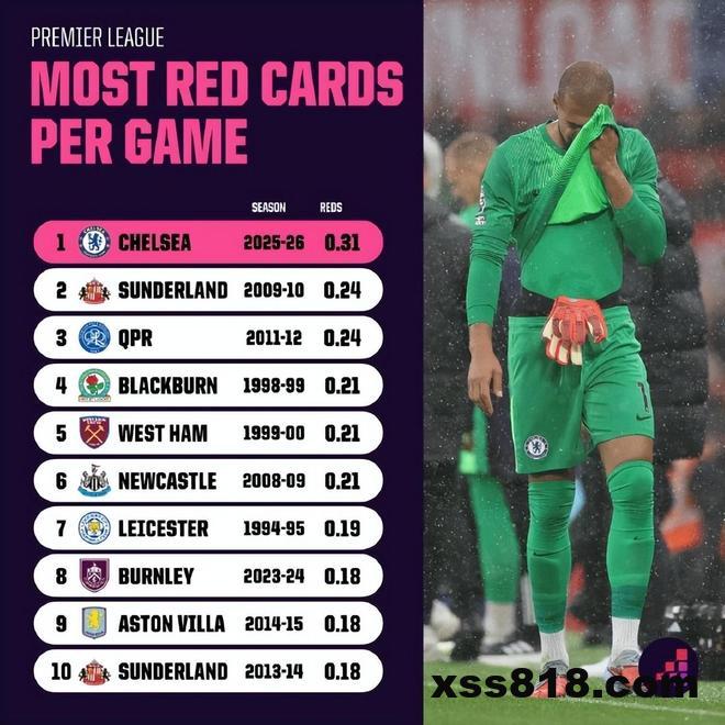 在赢下世俱杯冠军之后,切尔西的新赛季被很多人寄予厚望,没想到他们却跌入了“红牌陷阱”。他们爱英超前13轮拿到了4张红牌(场均0.31张),这个效率如果保持下去,甚至可以创造英超新纪录。